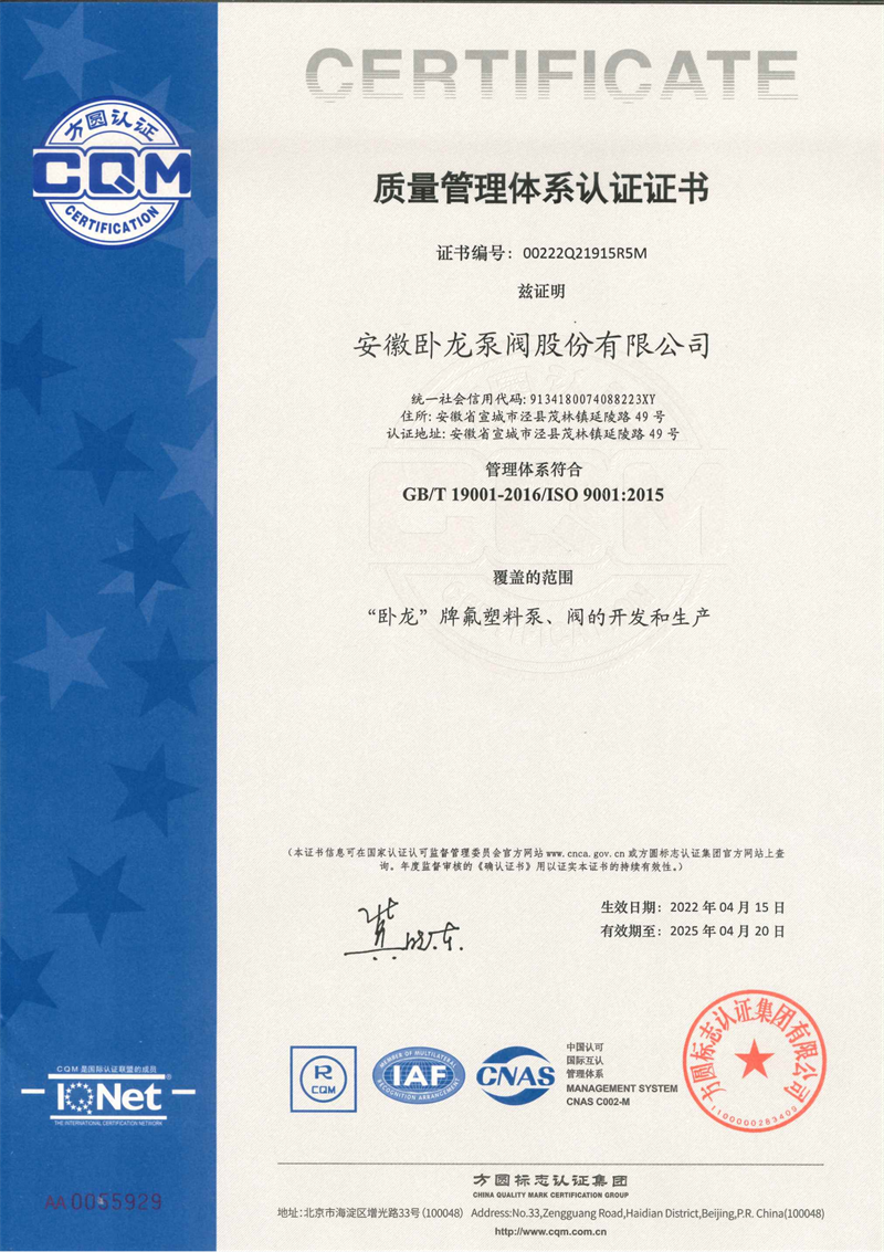 安徽臥龍泵閥股份有限公司位于風(fēng)景秀麗的江南古鎮(zhèn)——安徽省涇縣茂林鎮(zhèn)。公司前身涇縣氟塑料制品廠創(chuàng)建于1985年,是國內(nèi)較早引進中科院上海有機化學(xué)研究所專利材料——"氟塑料合金",并以此耐腐蝕材料專業(yè)生產(chǎn)制造化工泵、閥、襯氟管道等產(chǎn)品的企業(yè)。公司經(jīng)過歷次的改制變革,2015年更名為安徽臥龍泵閥股份有限公司。
